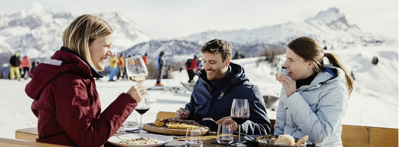 Fünf Hütten, fünf Spitzenköche, fünf Gourmet-Gerichte: Dieses Jahr kreieren unter anderem Drei-Sterne-Koch Massimiliano Alajmo („Tortellini in doppelter Brühe mit Weihrauch und Limette“) und die Brüder Cerea vom Da Vittorio („Fusilloni mit Kaninchenragout, Schokolade und Karamellcreme“) ihre Spezialitäten eigens für die Skisafari. Mit dabei sind außerdem Simone Cantafio (Hirsch-Ossobuco), Tomaž Kavčič (Gnocchi mit Speck und Garnelen) sowie Kräuterexperte Alessandro Dal Degan mit seinen knusprigen Fleischbällchen. Jedes Gericht wird mit einem passenden Südtiroler Wein serviert – ausgewählt von lokalen Sommeliers, einige davon persönlich vor Ort.