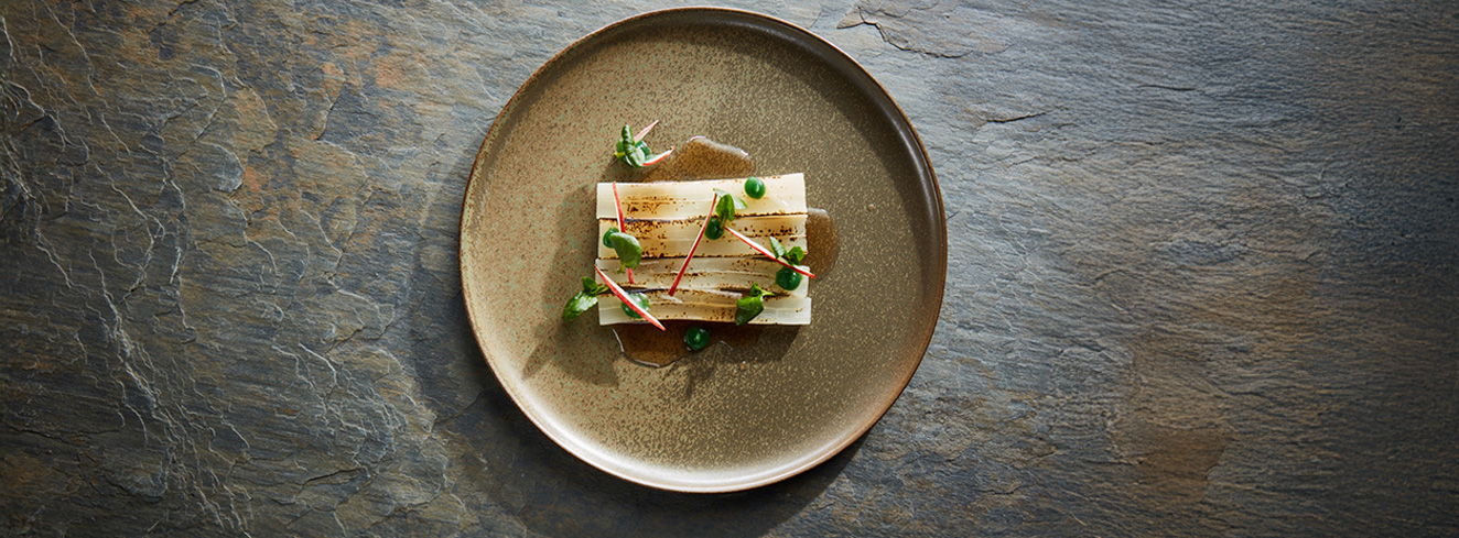 Die Schwarzwurzeln glasieren und längs halbieren. Mit einer Blow Torch kurz abbrennen und salzen. Etwas von der Kressecreme anrichten und die Schwarzwurzeln damit fixieren. Den Rest der Creme auf den Wurzeln auftupfen. Die Birnenspalten aus dem ISI Siphon passieren und die Spalten auf den Wurzeln arrangieren. Mit Kressespitzen garnieren.