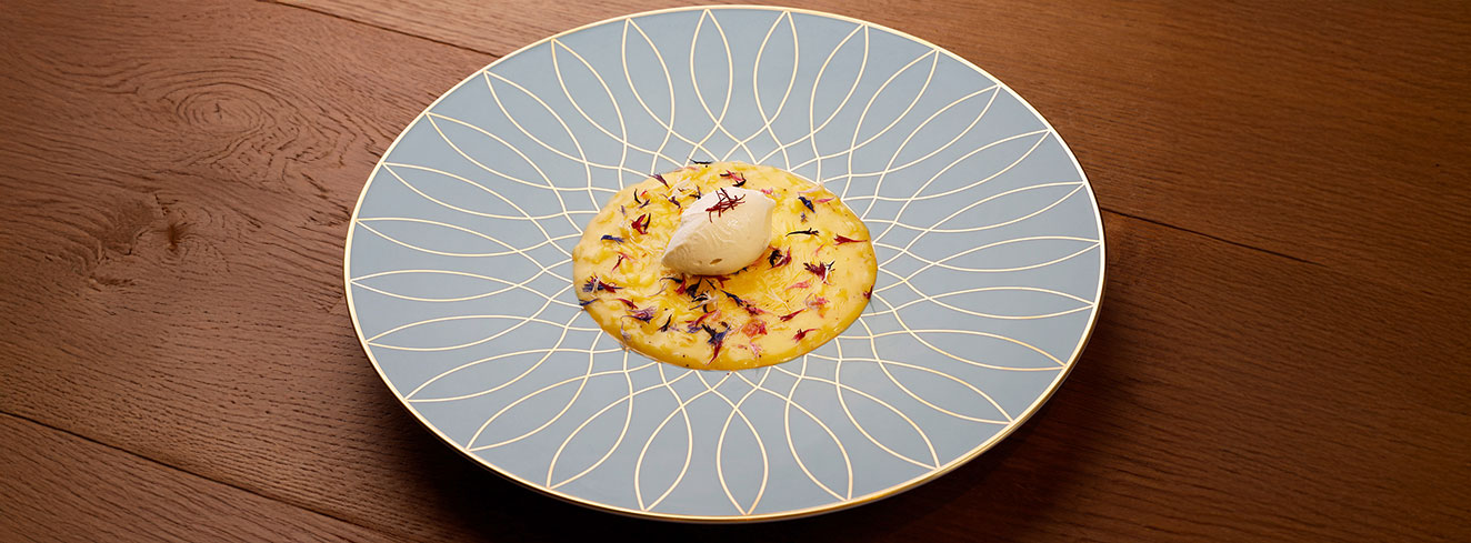 Ein Spiel aus Kontrasten: Mit seinem „Safranrisotto Montebianco mit Gorgonzola-Eis“ bringt Sternekoch Benedetto Russo aromatische Tiefe und kreative Finesse auf den Teller. Ein Rezept, das Tradition und Moderne eindrucksvoll vereint.