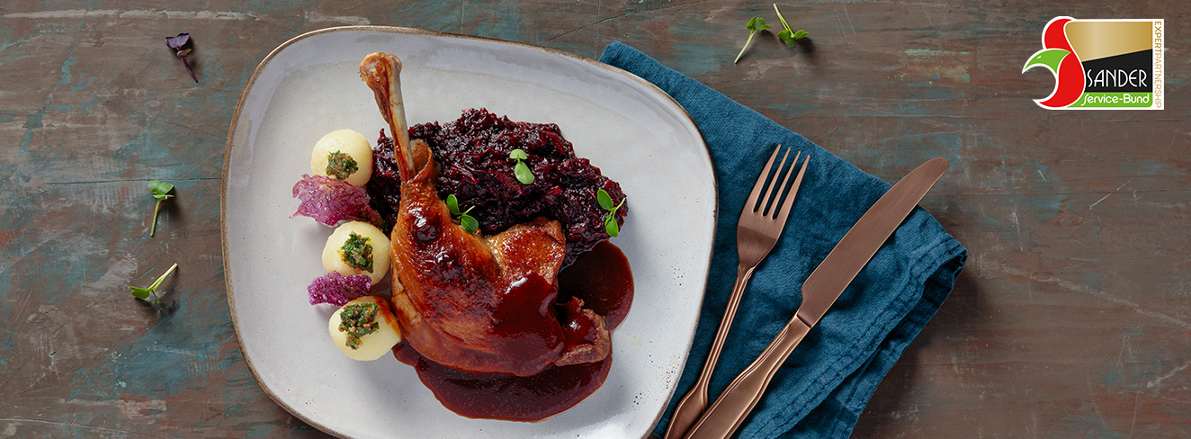 Das herbstlich-winterliche Saisonangebot „Farbenfrohe Vielfalt“ verbindet traditionelle Gerichte mit innovativen Neukreationen, die schnell und einfach zuzubereiten sind. Pünktlich zum Start in den Herbst stellen Sander und Service-Bund ein Saisonangebot mit einer Vielzahl an servierfertigen Menükomponenten in konstant hoher Qualität vor. Passend dazu werden À la Carte- und Buffetvorschläge angeboten, die sich direkt über den Webshop individuell konfigurieren und kalkulieren lassen. Mit den Highlights wie zartem Hirschedelgulasch mit Pfifferlingen, geschmorter Gänsebrust, Steinpilz-Kartoffel-Törtchen oder Apfel-Bacon-Wirsing sind Impulse vertreten, mit denen Gastgeber ihren Gästen genussvolle Stunden zum Jahresende bescheren.