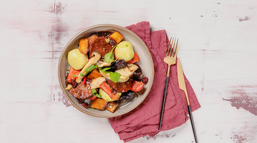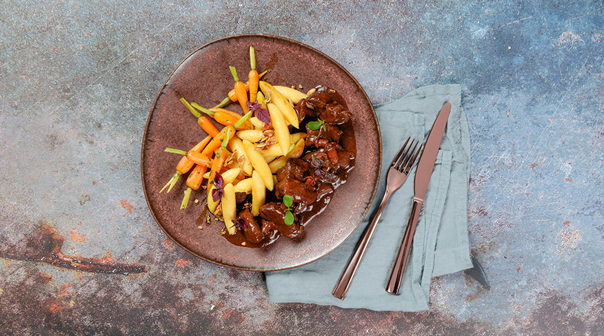 Der vegane Seitanbraten in Pflaumengewürzjus hält geschmacklich mit Spezialitäten wie Wildragout oder geschmorter Gänsebrust mit. Abgeschmeckt mit schwarzem Johannisbeerpüree, Zimt, Lebkuchen und Orange bietet die Fleischalternative interessante Geschmacksnuancen und ist eine spannende Erweiterung für Speisekarten.
